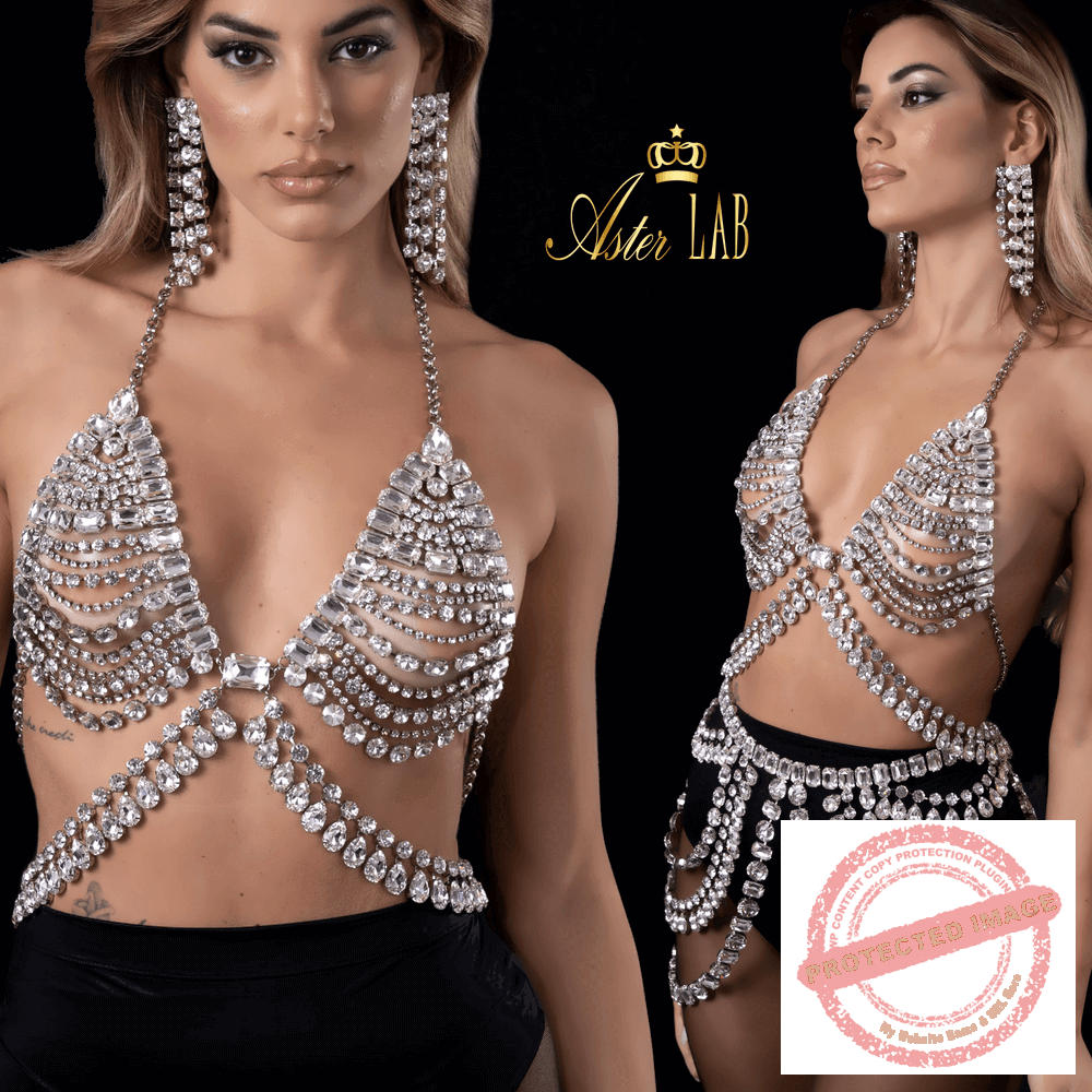 Perfetto per uno spettacolo di Burlesque con piume e orecchini a frangia, questo Crystal Top si trasforma in raffinato accessorio di moda se abbinato a una giacca semiaperta o aggiunto come elemento distintivo su un abito velato.